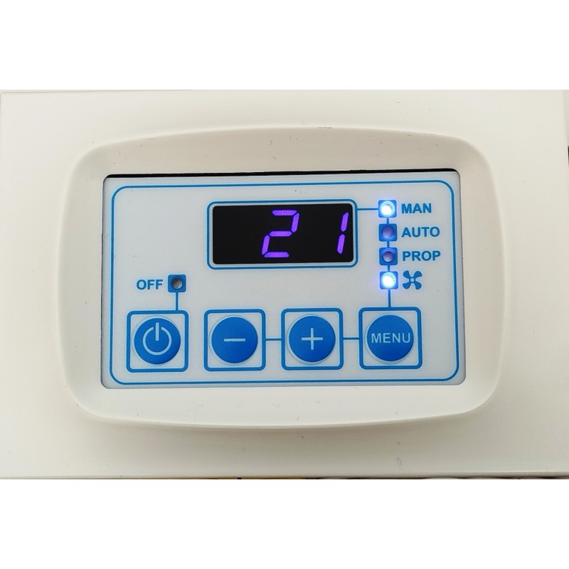Gestisce il ventilatore in modo manuale, automatico o proporzionale. Il display mostra la temperatura dell'aria. Tre moduli con cassetta da incasso in dotazione